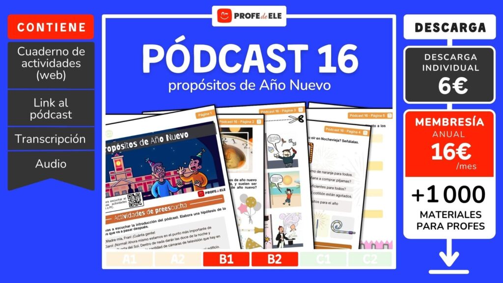 Escucha el podcast una vez. Tranquilo, escúchalo con calma y trata de quedarte con las ideas principales. Puedes utilizar los subtítulos si los necesitas. Después señala que elementos típicos de la Nochevieja en España no se mencionan en el pódcast.