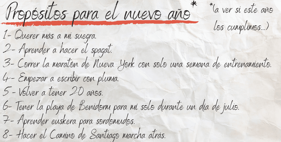 Lee la siguiente lista de propósitos de año nuevo que ha escrito una persona. ¡Qué locura!, ¿verdad?