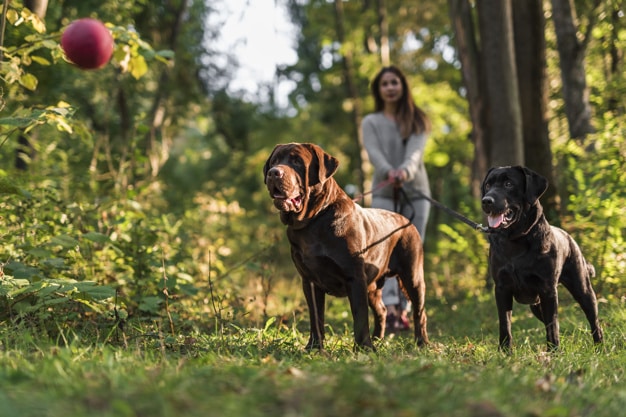 En la imagen hay una mujer con dos perros. Los perros están en primer plano. Los dos son bastante grandes, aunque el de la izquierda es algo más grande que el de la derecha. Uno de los perros es marrón y el otro negro. Da la impresión de que están a punto de echar a correr detrás de la pelota roja que podemos ver en la parte superior izquierda de la imagen. Detrás de los perros, en segundo plano, vemos a la dueña, que lleva a los animales atados con una correa. Es una mujer joven, de unos 30 años, de pelo castaño y parece que no muy alta. Está lejos, así que no podemos verla con detalle. Lleva ropa cómoda: una sudadera gris, unos pantalones vaqueros y unas deportivas. La mujer y sus dos perros están en un lugar amplio y luminoso. Al fondo se ven unos cuantos árboles. Por eso, creo que están en un bosque. Como la chica no está muy abrigada, imagino que es primavera y, por la luz de la imagen, quizás sea por la tarde. |