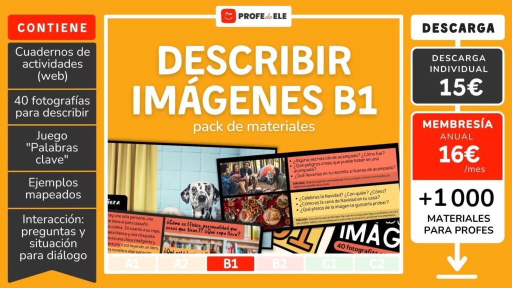 Actividades interactivas para describir imágenes en español, con infografía y fotos para practicar. Nivel B1.