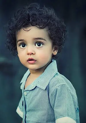 Es un niño muy guapo y bajo para su edad. Es moreno y tiene el pelo rizado y largo. Tiene los ojos negros y grandes. Tiene la nariz y la boca pequeña.