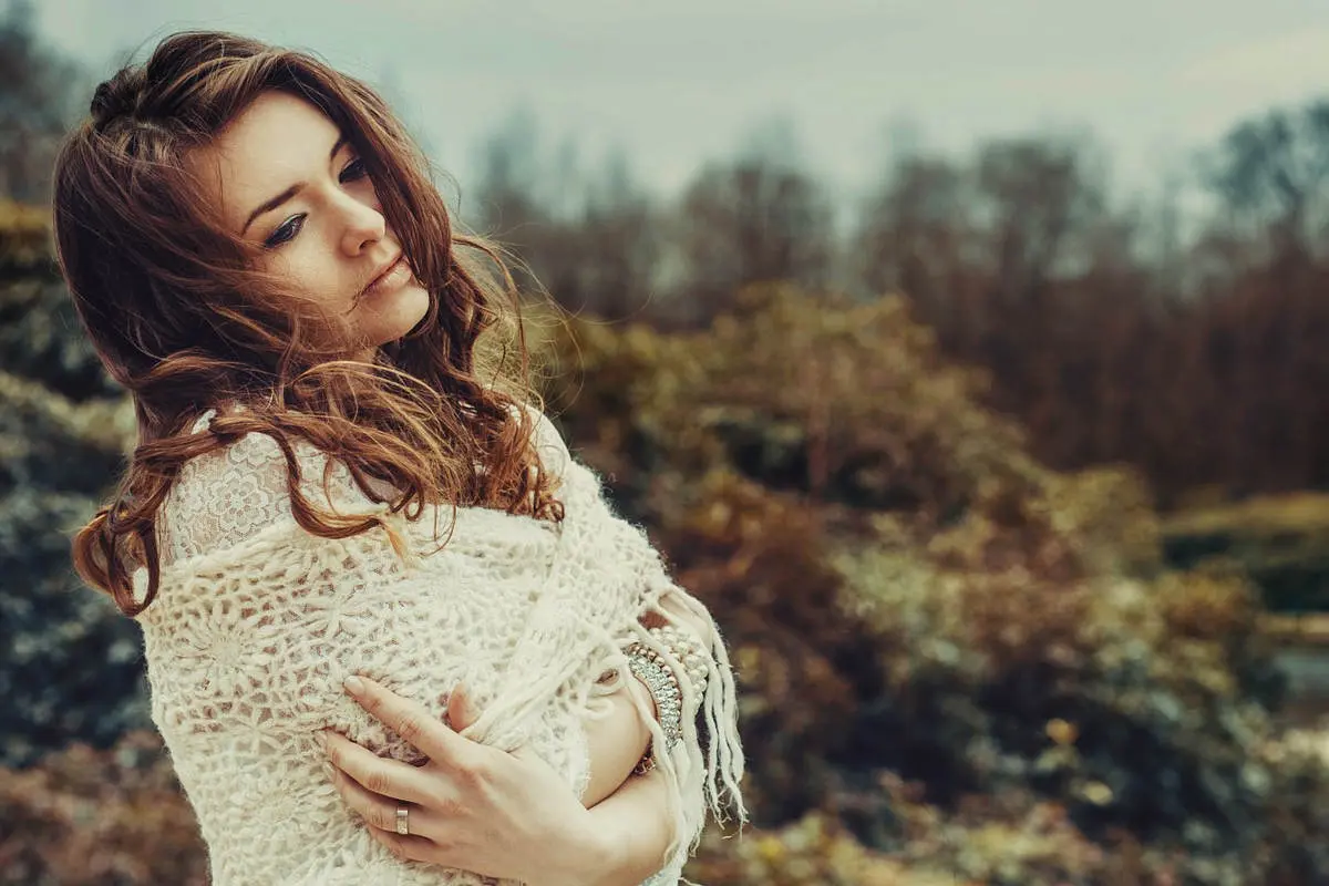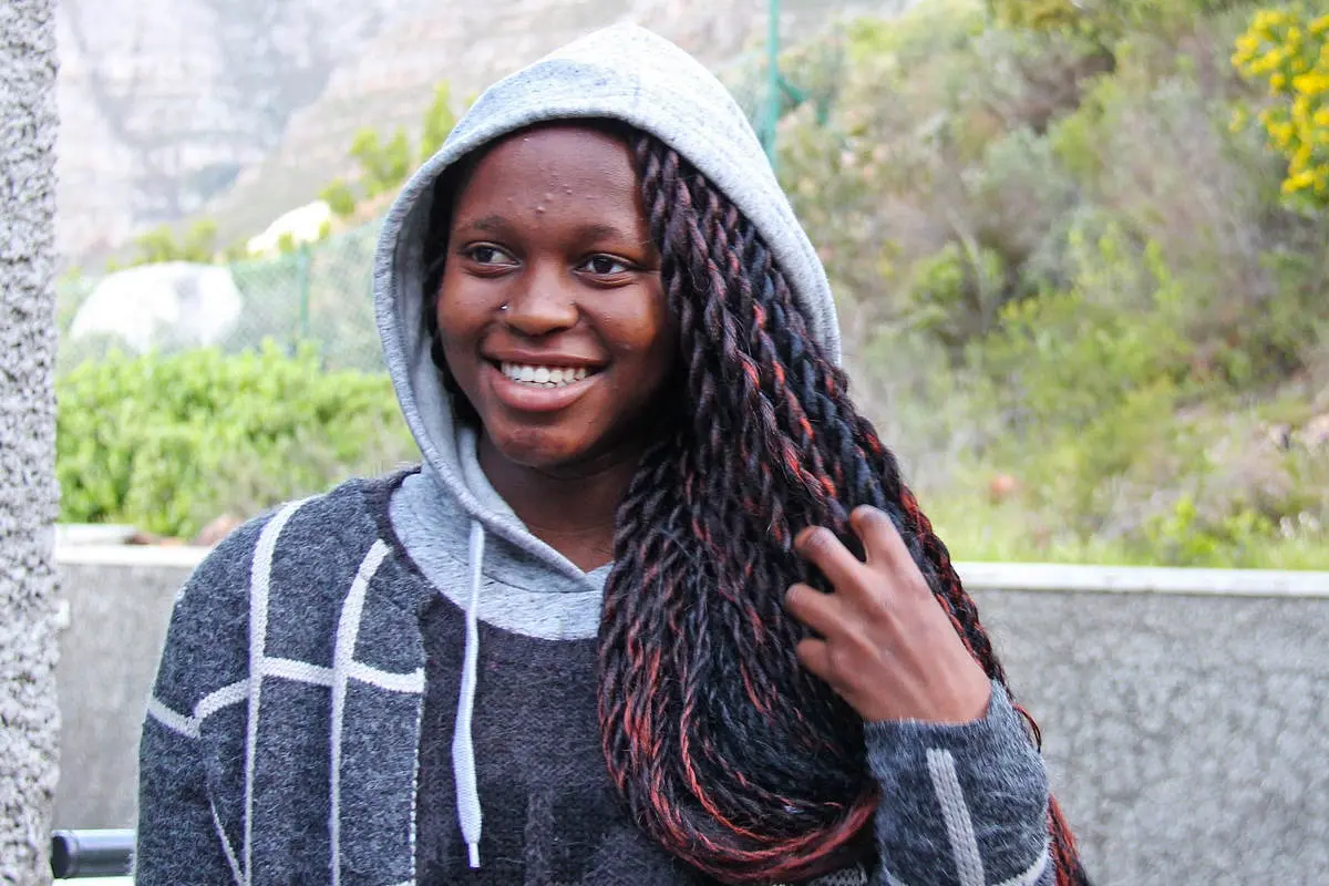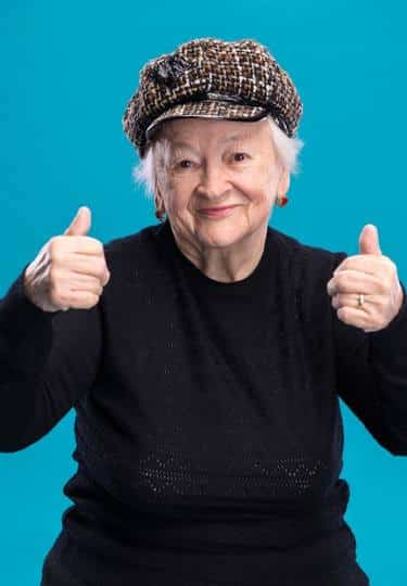 Es una mujer mayor muy simpática. Tiene un gorro de lana muy bonito. Por los lados se le ve un poco de pelo blanco. Tiene los ojos negros, los labios pequeños. Lleva unos pendientes rojos.