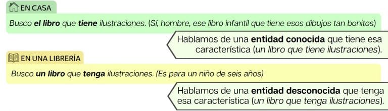 • Actividad 7: en este ejercicio se trabajan contenidos de gramática: el contraste entre indicativo y subjuntivo para diferenciar cuando una entidad es conocida o desconocida. Explica el ejemplo y dale tiempo a tus estudiantes para resolver el cuestionario.
