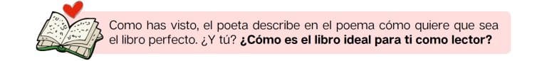 • Actividad 9: tus estudiantes deberán leer el poema, comprender el vocabulario y discutir sobre qué características debe tener su libro perfecto.