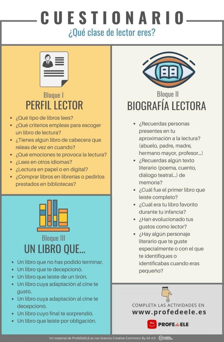 A continuación vas  a responder a un cuestionario sobre tu biografía y gustos lectores. Tienes tres posibilidades para hacerlo: Si trabajas solo puedes redactar un texto con tu...