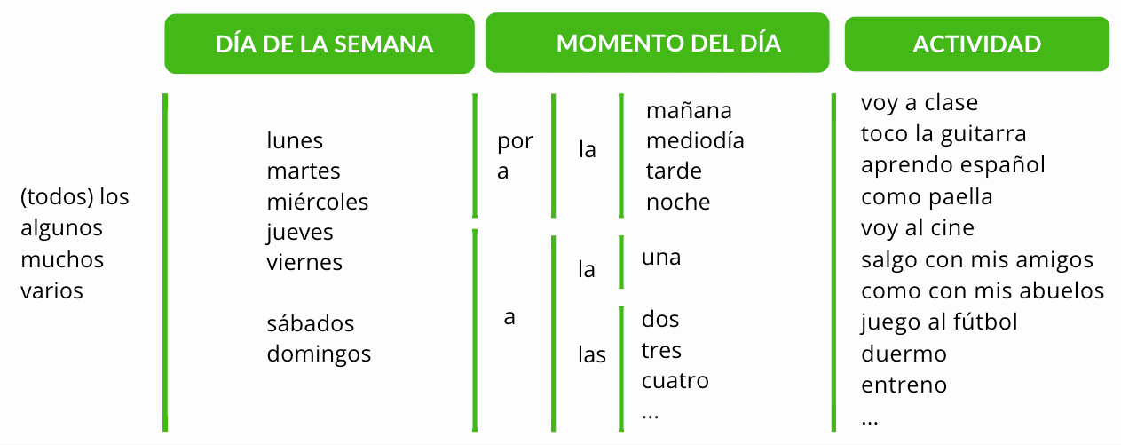 ¡Ahora hablas tú! Explica tu rutina de la semana. Utiliza este esquema: