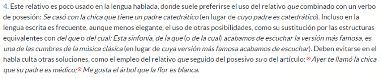 Como has podido ver, cuyo/a/os/as pertenece a un registro escrito. Observa lo que dicen al respecto el Diccionario Panhispánico de dudas y lo que dice Alberto Bustos en su Blog de lengua. Después, responde a las preguntas de abajo.