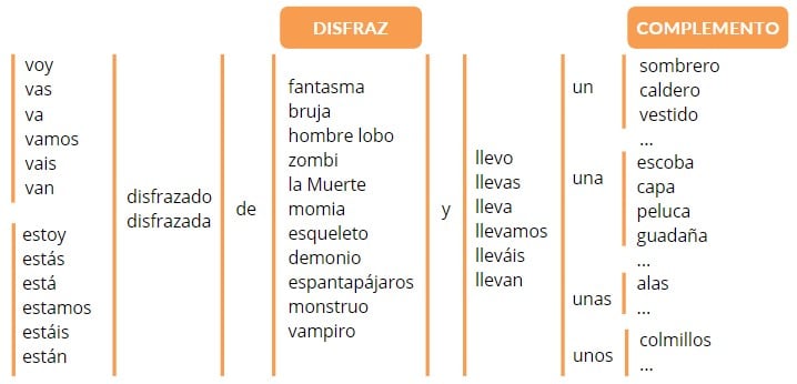 Observa este mapa de ideas del vocabulario de Halloween y arrastra las palabras del cuadro al grupo correspondiente. Después intenta recordar las palabras y escríbelas en los espacios.
