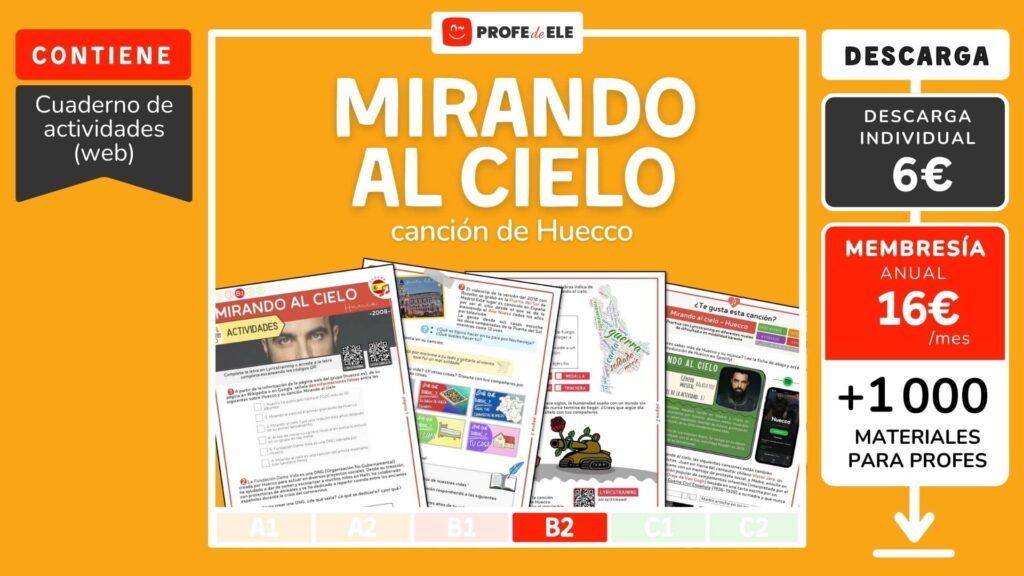 Ahora vas a escuchar la canción titulada Mirando al cielo de Huecco. Completa esta actividad en Lyricstrainning y después vuelve a ProfeDeELE para seguir con el resto de activid...