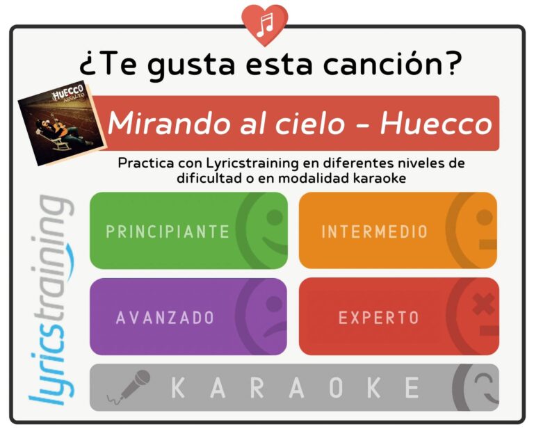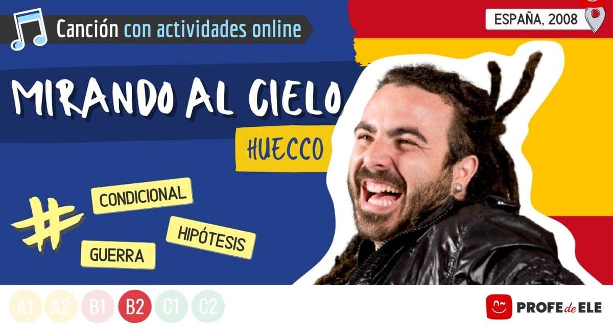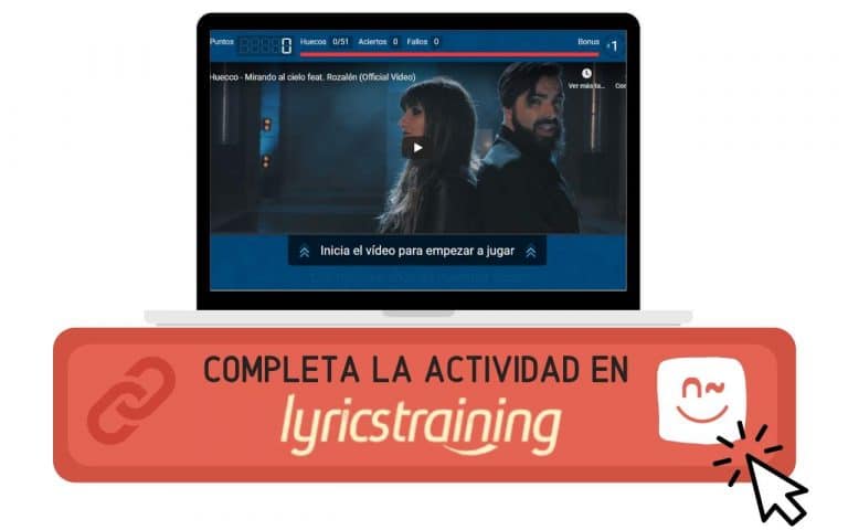 Ahora vas a escuchar la canción titulada Mirando al cielo de Huecco. Completa esta actividad en Lyricstrainning y después vuelve a ProfeDeELE para seguir con el resto de actividades.