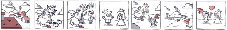 En su poema, José Agustín Goytisolo habla de un mundo al revés. Como ves, los cuentos y las leyendas se pueden transformar. Abajo tienes una ilustración para el final de una nueva versión de la leyenda de san Jorge. Haz alguna hipótesis sobre qué crees que ha podido cambiar respecto a la leyenda original.