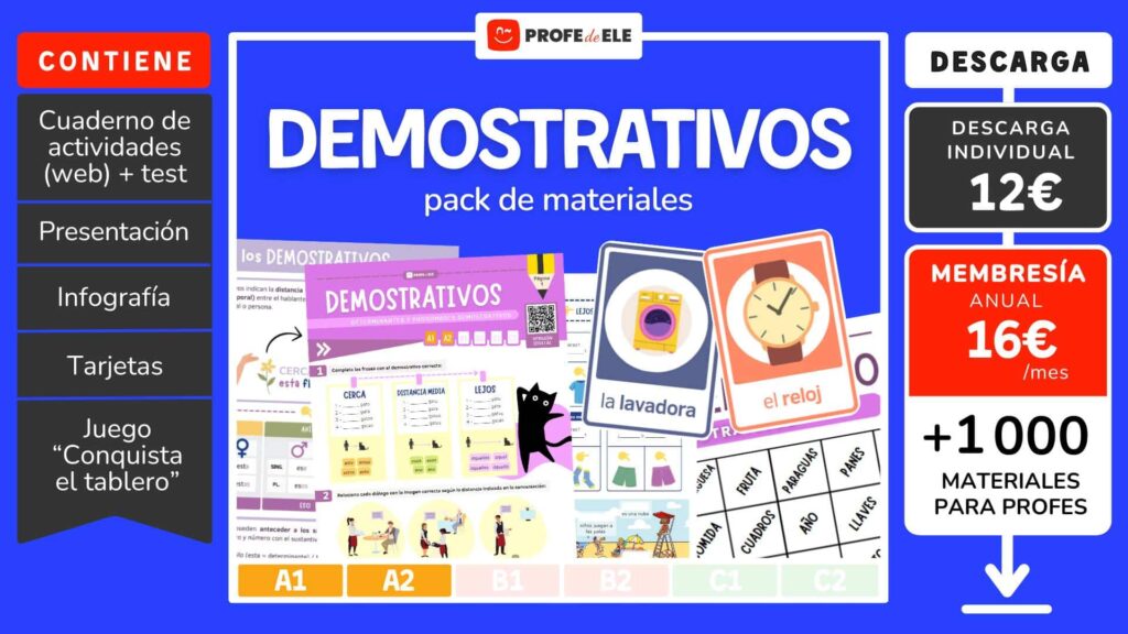 Enseña los demostrativos con esta secuencia A1-A2. Incluye 10 actividades dinámicas, test auditivo, material descargable y recursos adicionales.