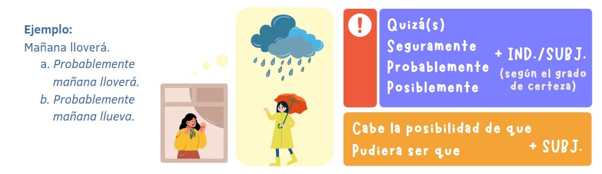 A continuación encontrarás oraciones que expresan seguridad. Tu tarea es reformular cada una de estas oraciones para que expresen probabilidad o posibilidad usando los siguientes marcadores: quizá(s), seguramente, posiblemente/probablemente, pudiera ser que…, cabe la posibilidad de que…