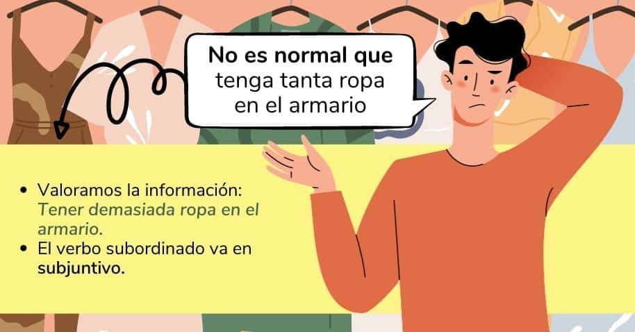 odio que   –    me encanta que   –    me parece bien que   –    me parece mal que   –    me parece ridículo que   –    me preocupa que   –    es absurdo que   –    es un escándalo que