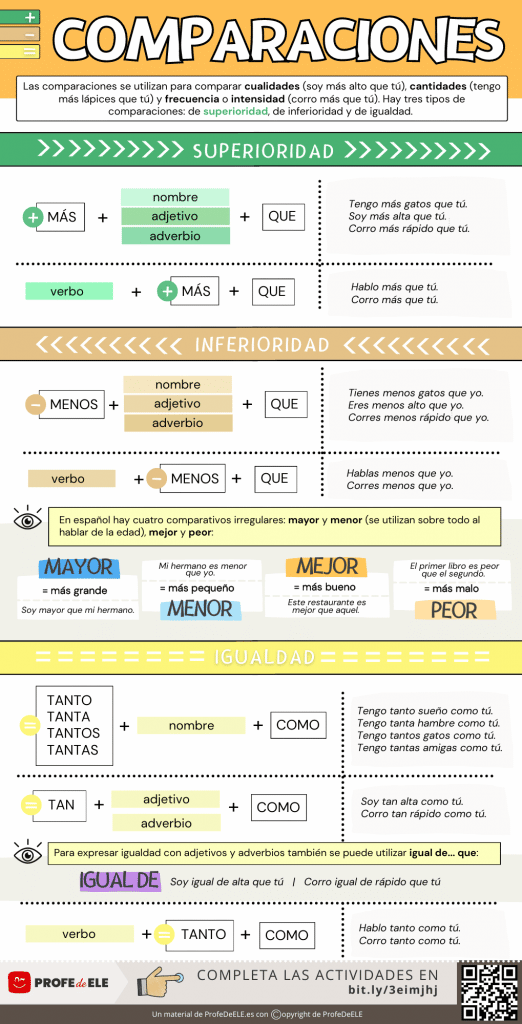 En esta actividad de nuestra web dedicada al aprendizaje del Español como Lengua Extranjera (ELE), te ofrecemos una experiencia completa y detallada para practicar las oraciones comparativas en español. Esta actividad está pensada para ayudarte a dominar las estructuras de comparación en el idioma, incluyendo aspectos como la superioridad, la inferioridad, los comparativos irregulares «mayor» y «menor», así como las expresiones de igualdad.