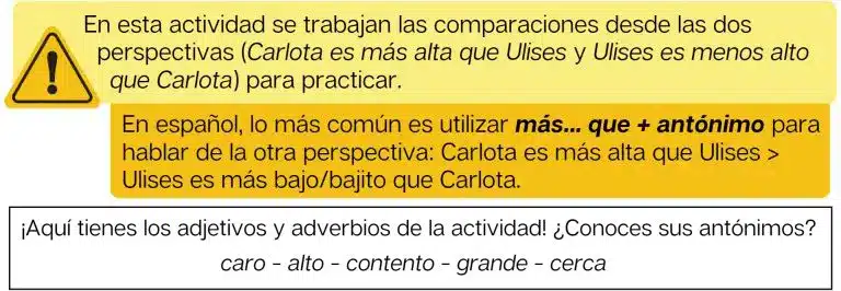 Como material complementario, dispones de una infografía adicional, un cuadernillo de actividades, un juego de «esto o aquello», personajes para comparaciones personalizadas, un dado interactivo y tarjetas con expresiones comparativas.
