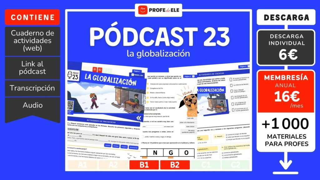 En este pódcast para aprender español de nivel B1-B2 hablaremos de la globalización y sus consecuencias positivas y negativas en nuestra vida. Contiene ejercicios interactivos para aprender y debatir sobre esta realidad. Además de estos ejercicios online, puedes descargar el material complementario que incluye un cuadernillo para imprimir con las actividades de la web y el archivo de audio.