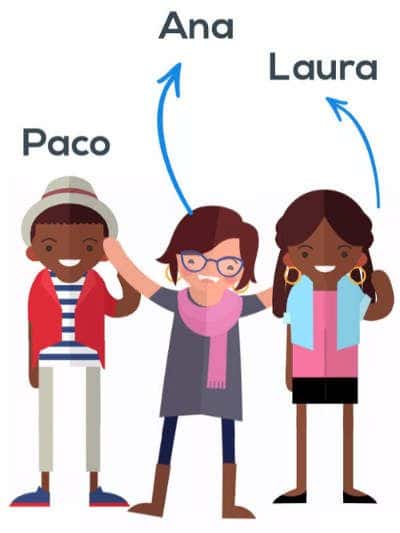 - Actividad 2. Seguimos con los personajes de Paco, Ana y Laura. En esta actividad se presenta un diálogo escrito y locutado para trabajar la comprensión auditiva y cuyas intervenciones, además, sirven como ejemplos de producción para la tarea final. El objetivo de esta actividad es doble: por un lado, mostrar los posesivos tónicos en contexto y, por otro, mostrar su pronunciación. Se puede completar la tarea bien mientras se reproduce el audio (recomendamos reproducirlo dos veces), o bien se puede tratar de completar antes y después corregir con el audio. Una vez completada, las y los estudiantes pueden representar el diálogo imitando lo que acaban de escuchar.