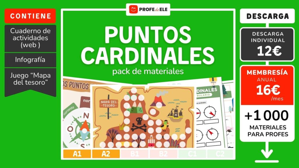 Ejercicios web gratis para aprender los puntos cardinales en español (norte, sur, este, oeste…). En esta página encontrarás: una infografía con los puntos cardinales y 7 actividades interactivas para practicar (un juego de memoria, mapas…). El material complementario para descargar incluye: la infografía, el cuadernillo con los ejercicios interactivos en formato PDF para imprimir y una actividad de vacío de información con un mapa del tesoro. Si te interesa, lo puedes descargar pagando una pequeña cantidad o puedes suscribirte a una de nuestras membresías y acceder a todos nuestros materiales.