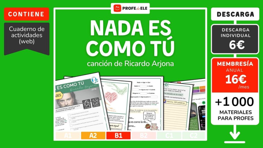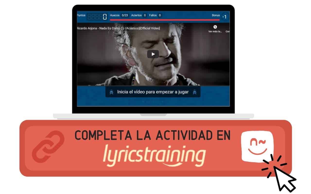 Ahora vas a escuchar la canción titulada Nada es como tú de Ricardo Arjona. Presta atención a los verbos para conjugarlos en indefinido, completa esta actividad en Lyricstrainning y después vuelve a ProfeDeELE para seguir con el resto de actividades.