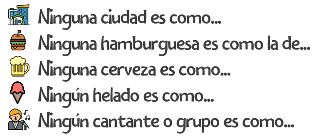 Por ejemplo: Ninguna ciudad es como Bilbao. Es moderna, no es muy grande y tiene el mar y el monte al lado.