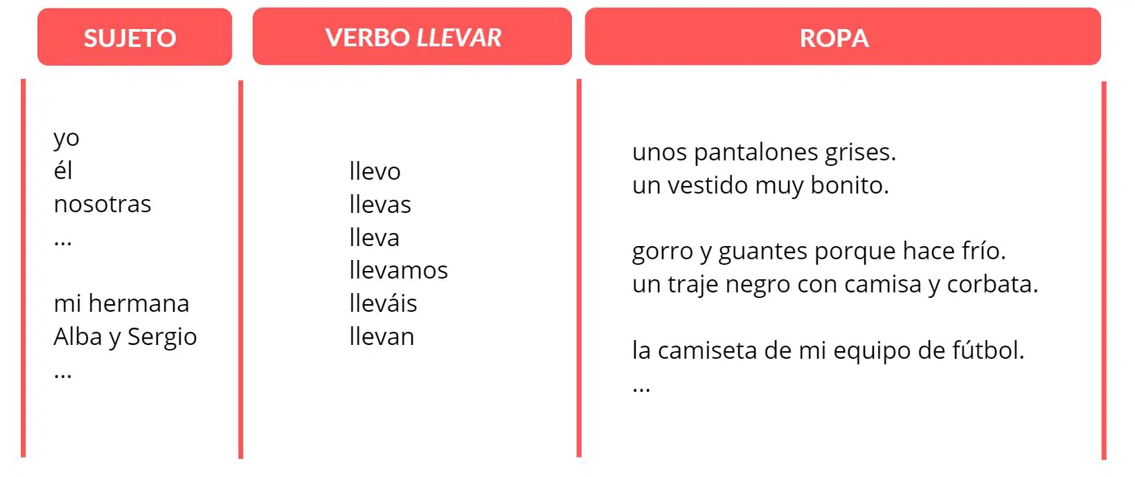 Hoy mi profesora lleva un vestido azul y unas botas negras. Laura y yo llevamos vaqueros, pero ella lleva un jersey y yo una camisa blanca. |