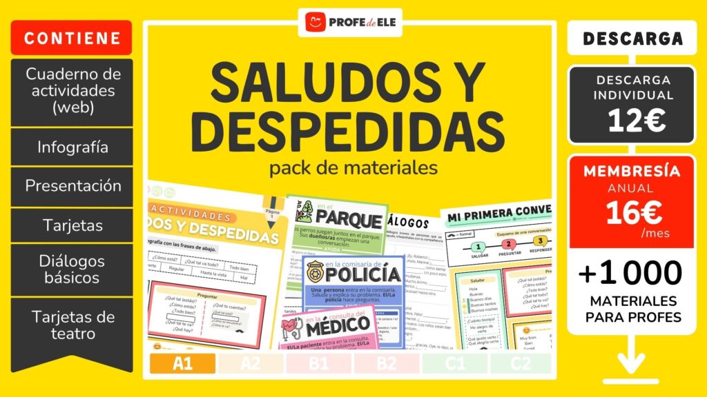 En la descarga encontrarás la presentación, la infografía, un cuaderno con las actividades de la web, 48 fichas con fórmulas de saludos y despedidas en español (las trabajadas en esta unidad y algunas nuevas),  6 diálogos simples para completar y 12 tarjetas con situaciones y ejemplos para interpretar teatros básicos de nivel A1.