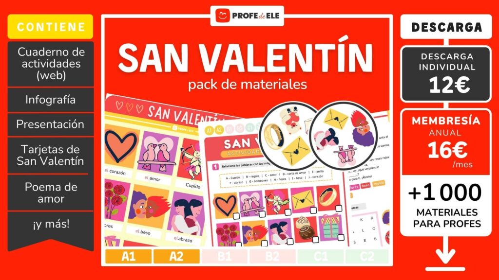 Actividades de español nivel A1-A2 para practicar el léxico del Día de San Valentín (14 de febrero) que trabaja la expresión y comprensión, tanto oral como escrita a través de 10 actividades interactivas online. Es un contenido completo y dinámico para estudiantes de la clase de Español como Lengua Extranjera (ELE) de niveles iniciales (A1-A2).