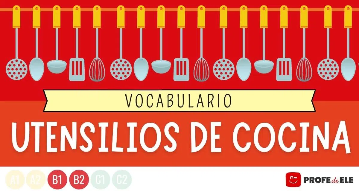 Esta unidad didáctica sobre el vocabulario de los utensilios de cocina en español tiene como objetivo presentar los principales utensilios de cocina en español. Si ya conoces nuestras entradas de vocabulario (la fruta, los deportes), sabrás que estas secuencias incluyen al inicio una explicación visual, normalmente en forma de infografía o imagen, donde se presenta una selección de palabras en español sobre el tema. Esta entrada incluye un ejercicio de yuxtaposición de la infografía con el nombre y sin el nombre para tratar de adivinar la palabra correcta y un ejercicio de memoria para practicar el vocabulario de nivel B1-B2.