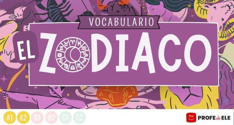 Infografía del vocabulario del zodiaco y pack de actividades interactivas para practicar el vocabulario de los 12 signos del zodiaco en español + material descargable.